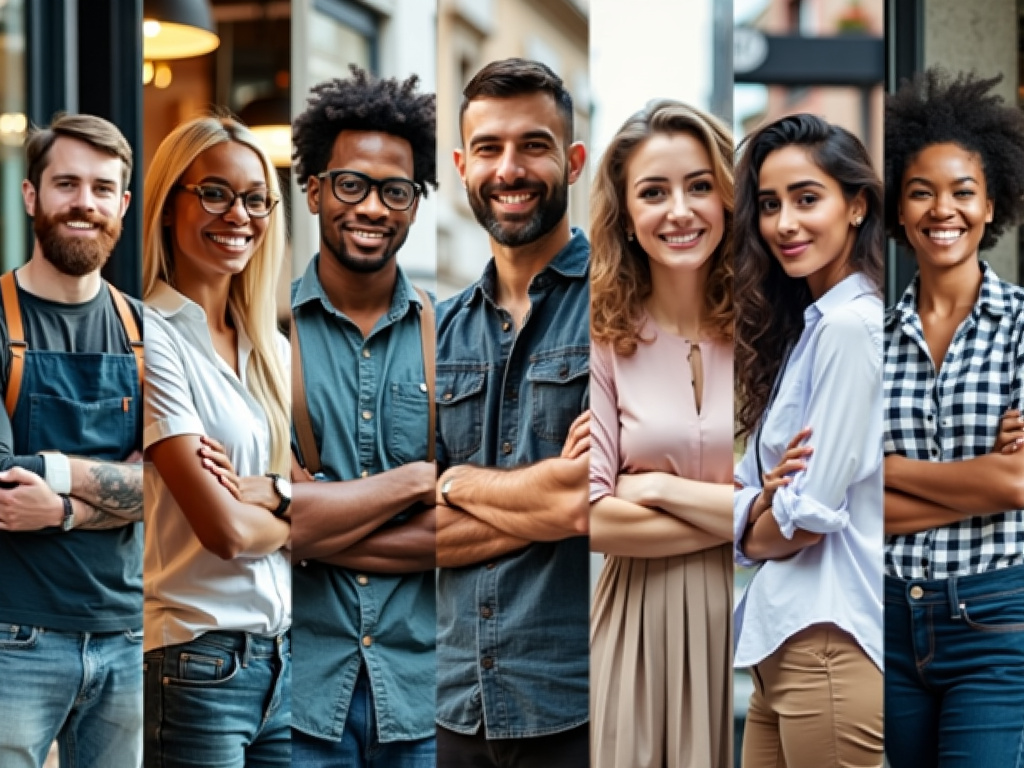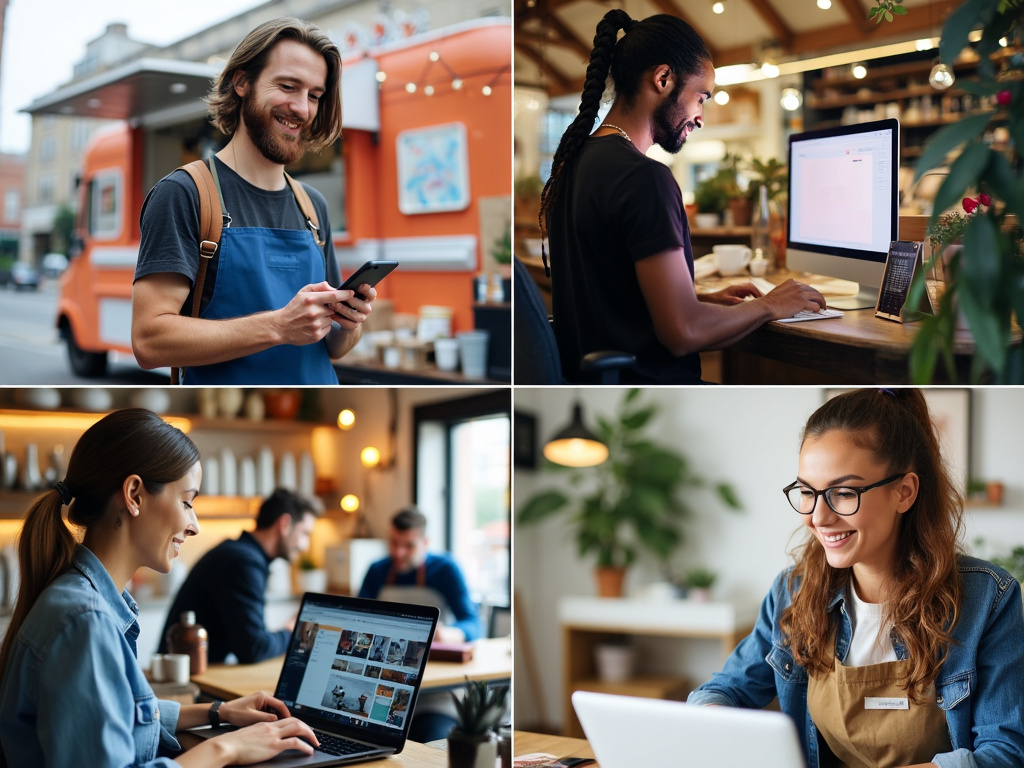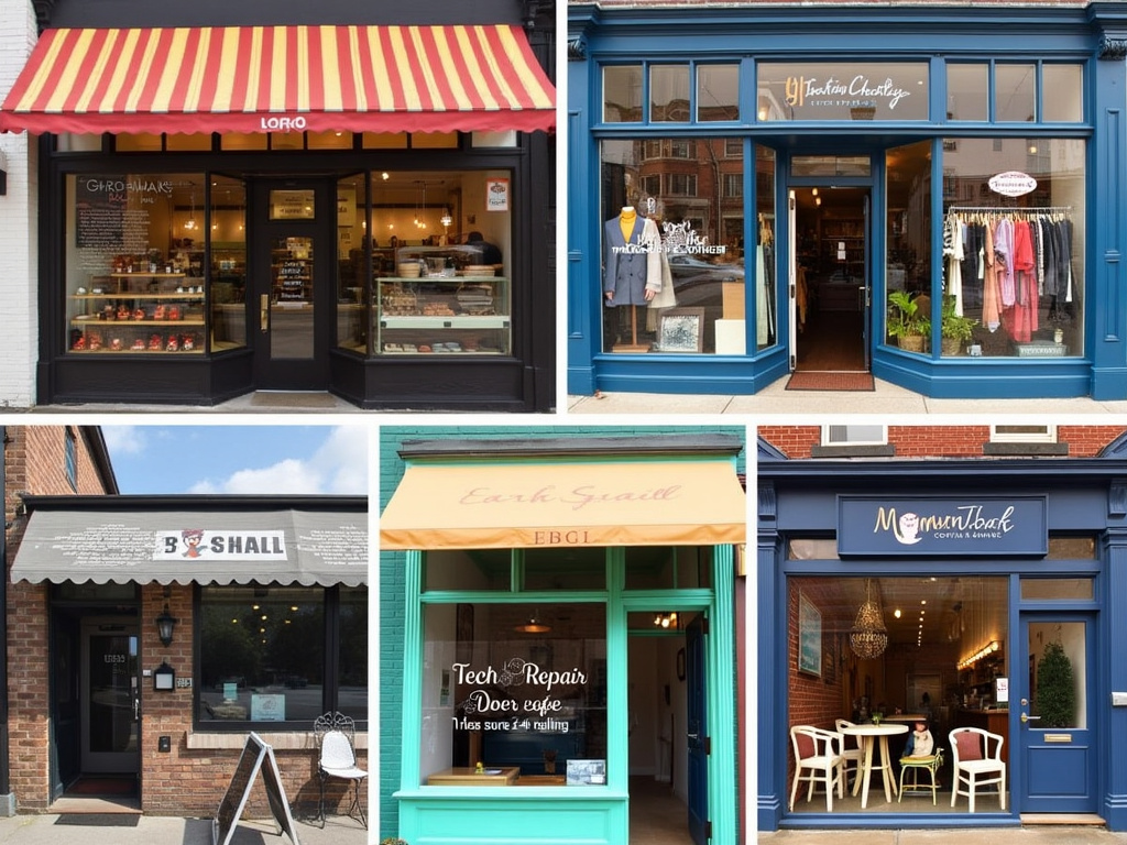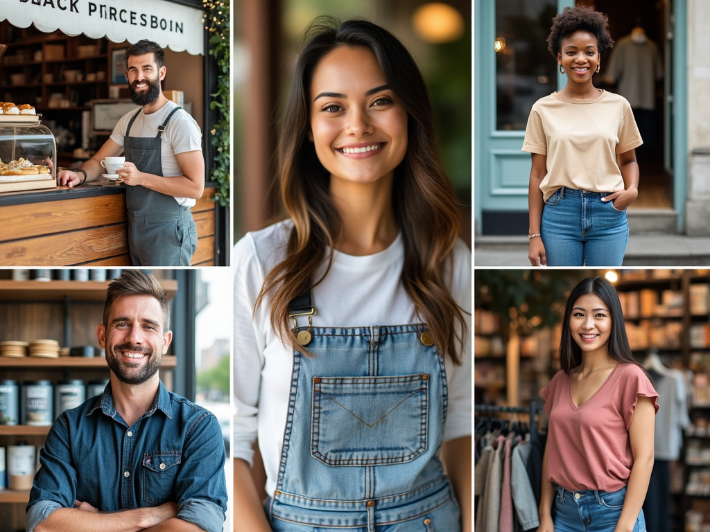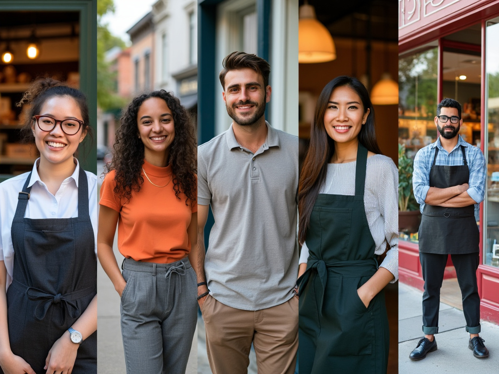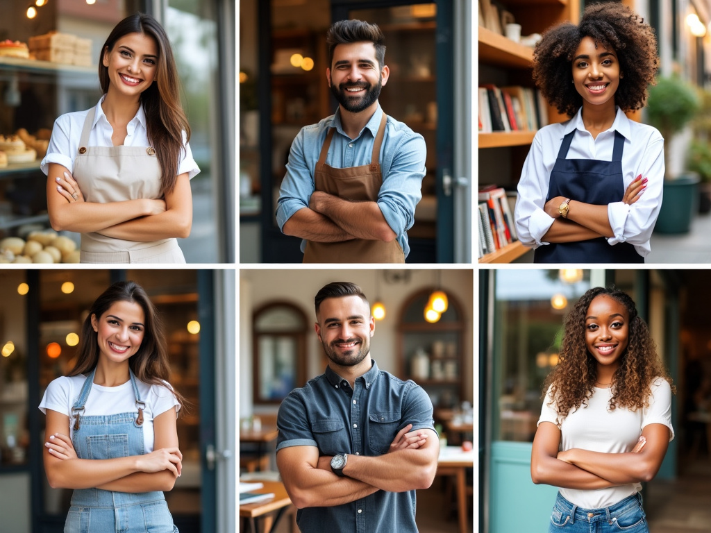 A collage of diverse small business owners standing in front of their shops, including a bakery, bookstore, cafe, and boutique clothing store. The image conveys a sense of optimism and success, with smiling entrepreneurs proudly displaying their business signs or products.